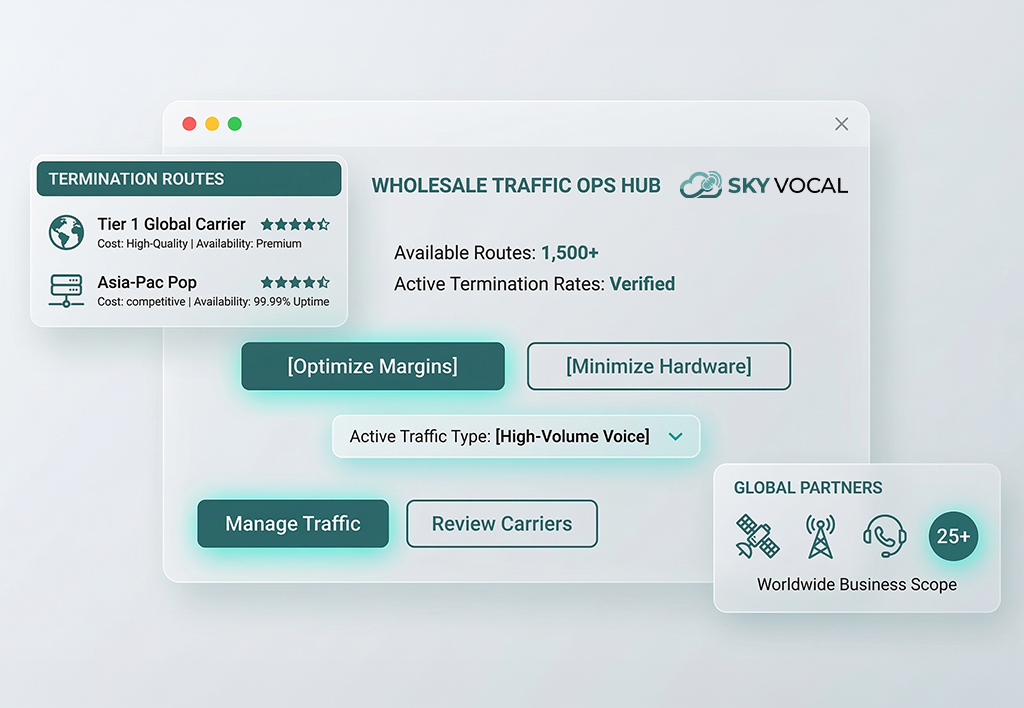 Skyvocal delivers premium wholesale VoIP termination for telecommunication carriers, call centers, and high-volume businesses worldwide. As a trusted VoIP provider, we offer competitive termination rates that maximize your margins while requiring minimal initial investment—helping you generate greater revenue from day one. Whether you’re a growing startup or an established carrier, our tailored wholesale solutions provide dependable, high-quality voice termination wherever you have an internet connection. Manage your entire voice traffic operation from anywhere using your computer no additional hardware required.